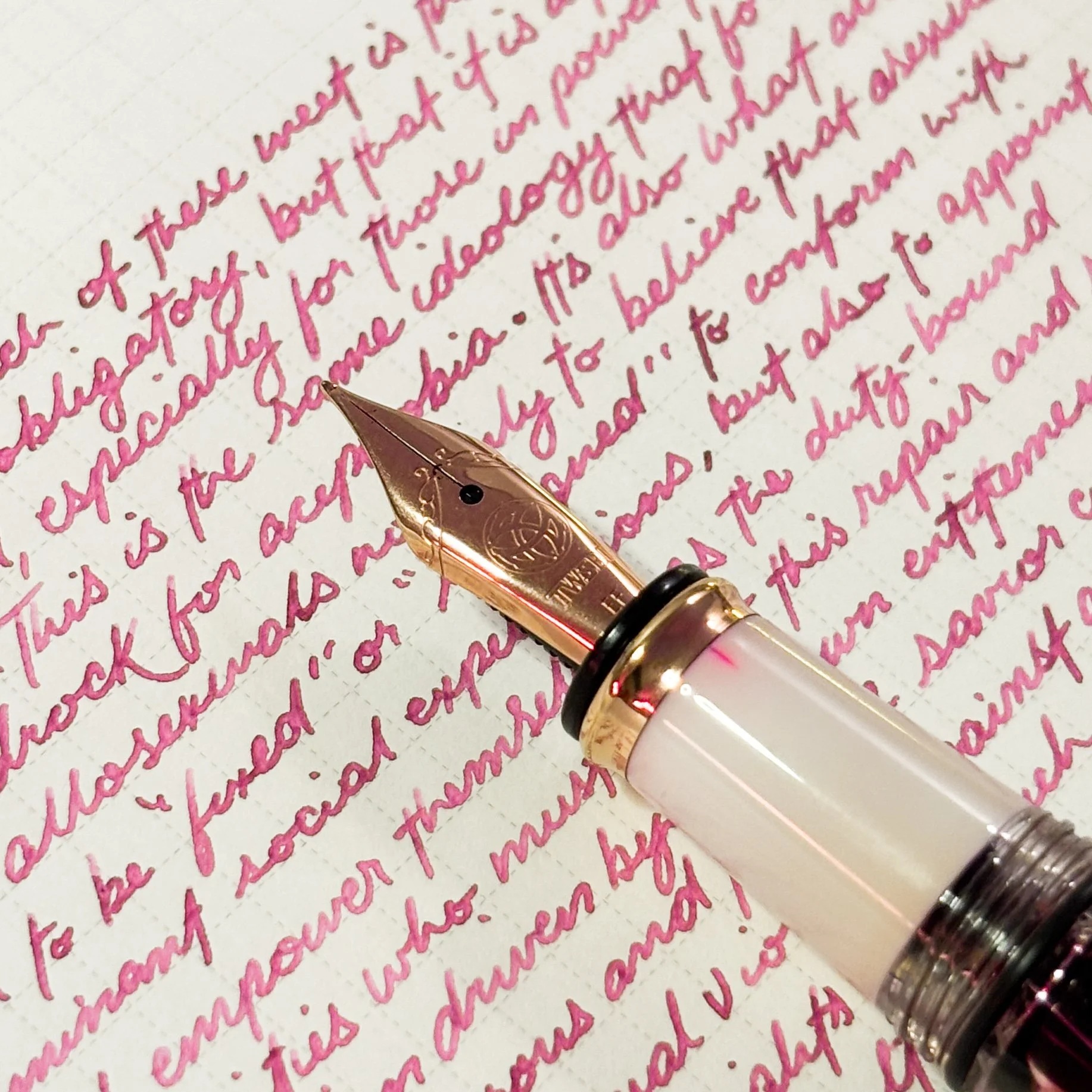 It did remind me of Handel from Diamine, in the muted pink with greenish-gold sheening to it on the large swatch. That might be an easier find for our non-American friends. Pompadour Cotinga Burgundy though, at least in writing, is certainly brighter and much more pink.