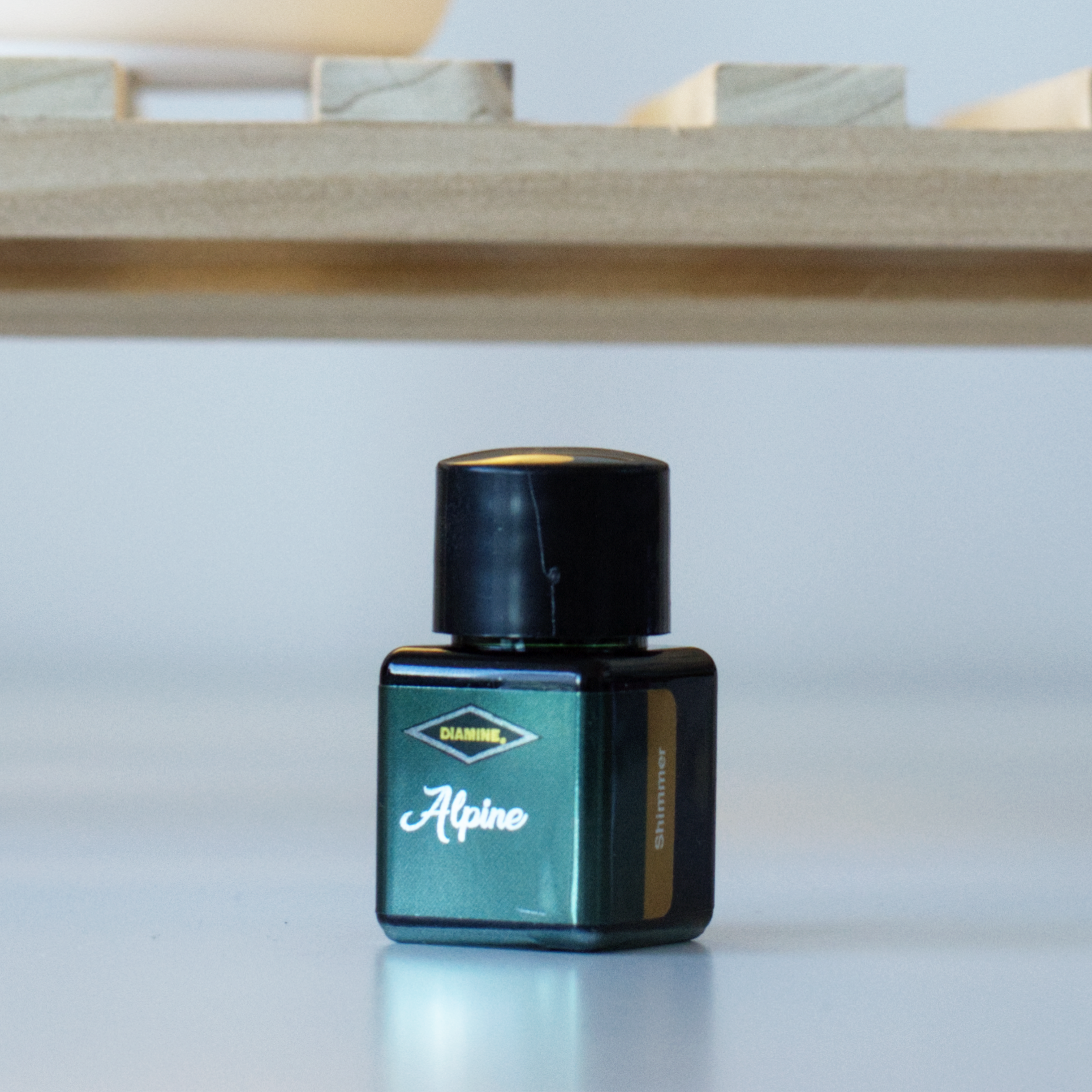 Alpine is a muted dark green fountain pen ink, chock full of silver shimmer. On the Tomoe River paper, there’s a wee bit of shading in the large swatch. It’s giving snake house colours, and while it’s a pretty ink it probably won’t make it into my frequent inks (I just want more aggressive shinies).