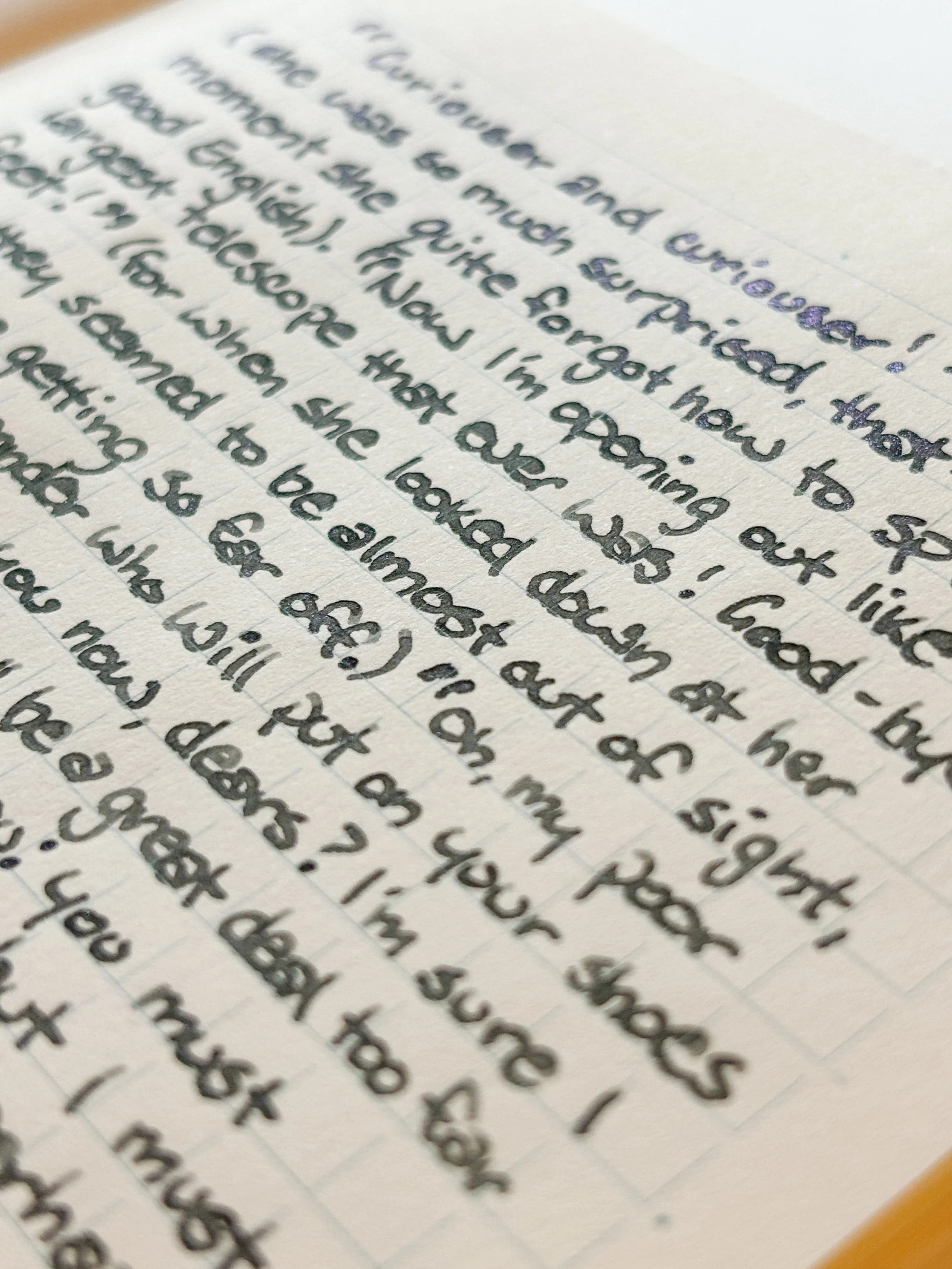 Moon Beam kind of feels like a subtle ink to me (you might not think it later when you see the shimmer close-up). But in writing, and in swatches, the shimmer isn’t really visible from direct line of sight. I think in my range of grey inks, I have some that are much more exciting, so while the ink is pretty on it’s own, I think I just have ones that are a bit nicer.