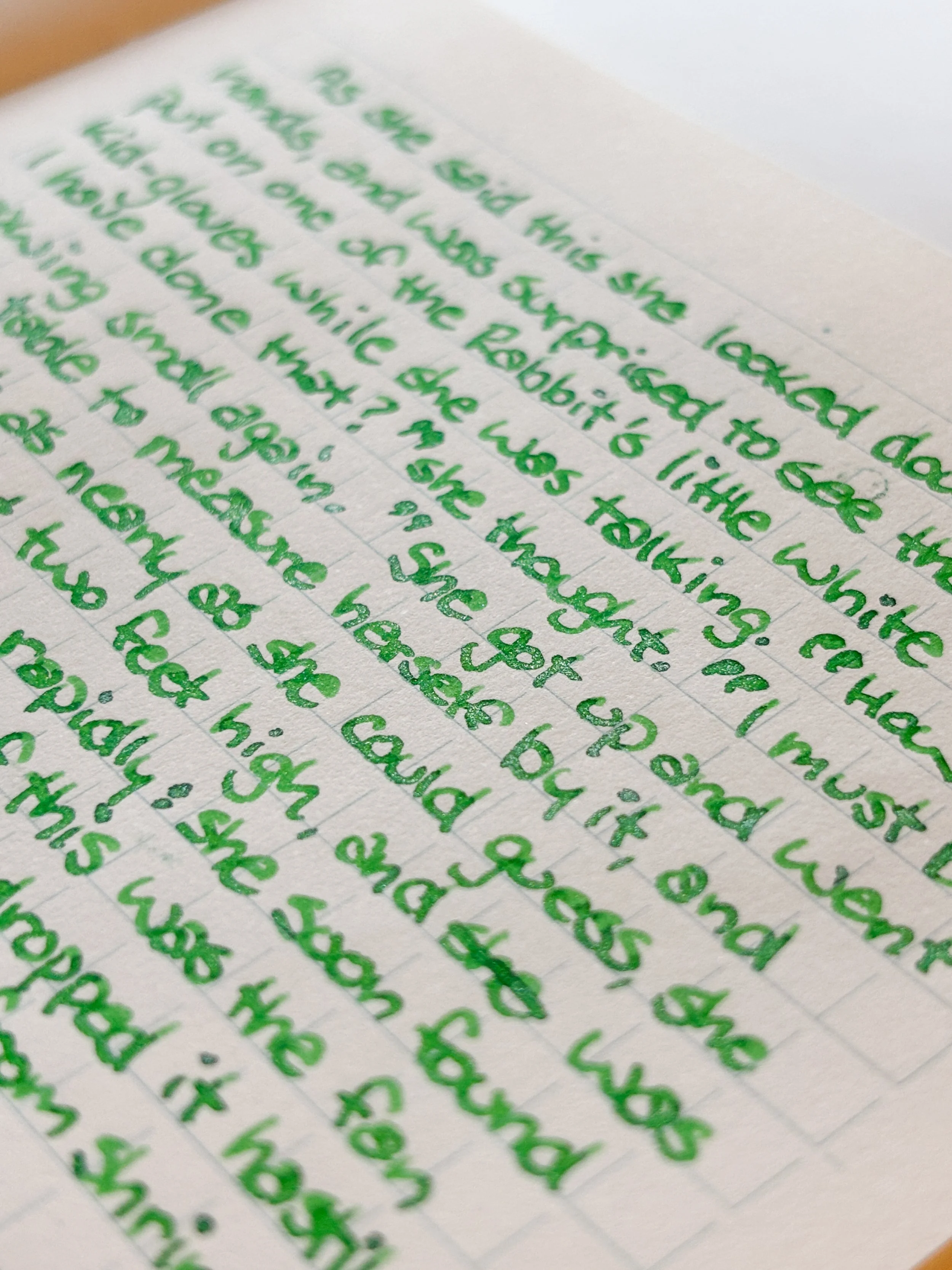 The colour is interesting - like I mentioned before it sort of looks like grass, but I also see broccoli. I think the silver shimmer does compliment the ink quite well. There’s also some bonus deep red sheening in large pools of ink.