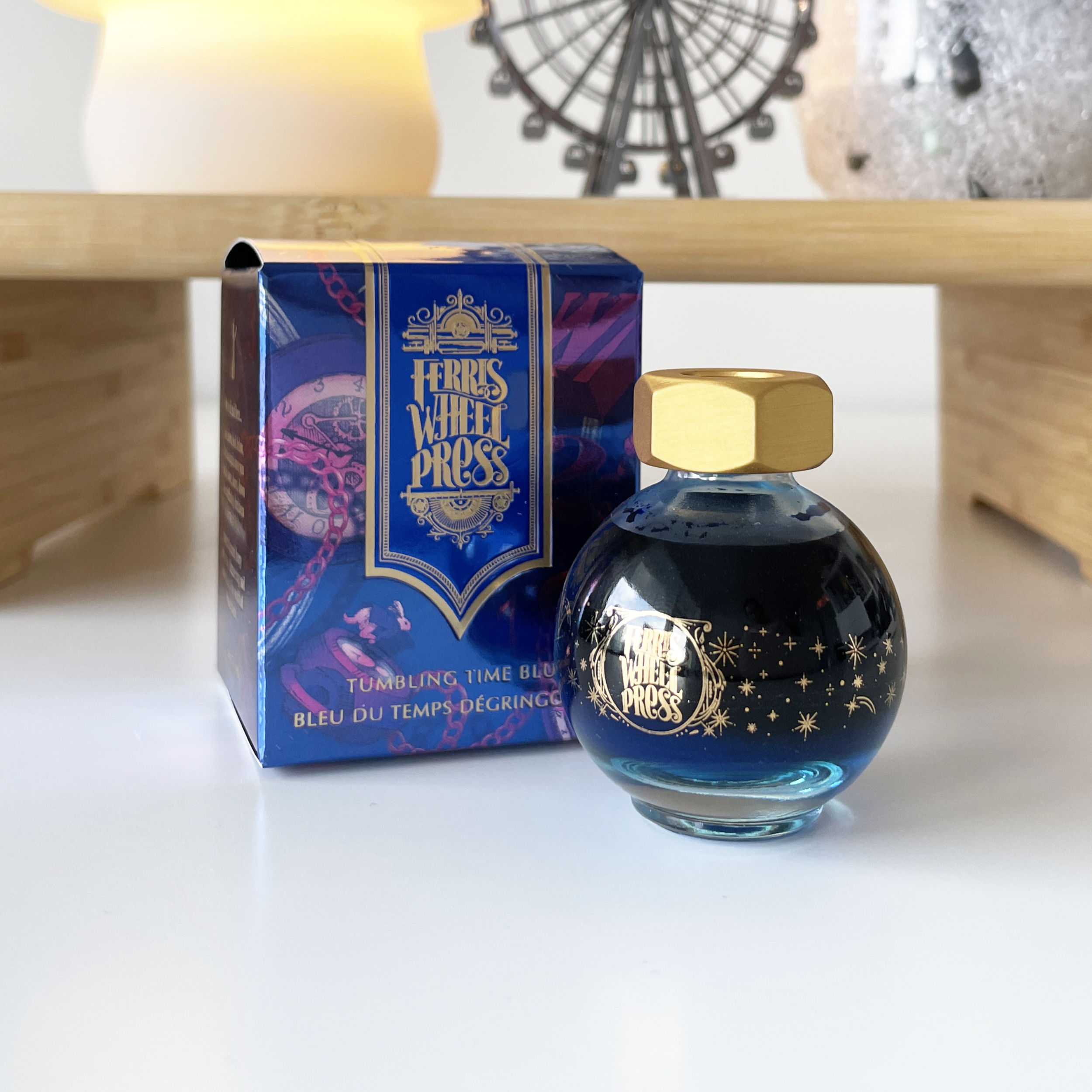 Today’s fountain pen ink from Canadian brand Ferris Wheel Press, is one of the original trio released under the Ferritales series. IT’s a medium, rich blue with lots of sheening and shimmer.