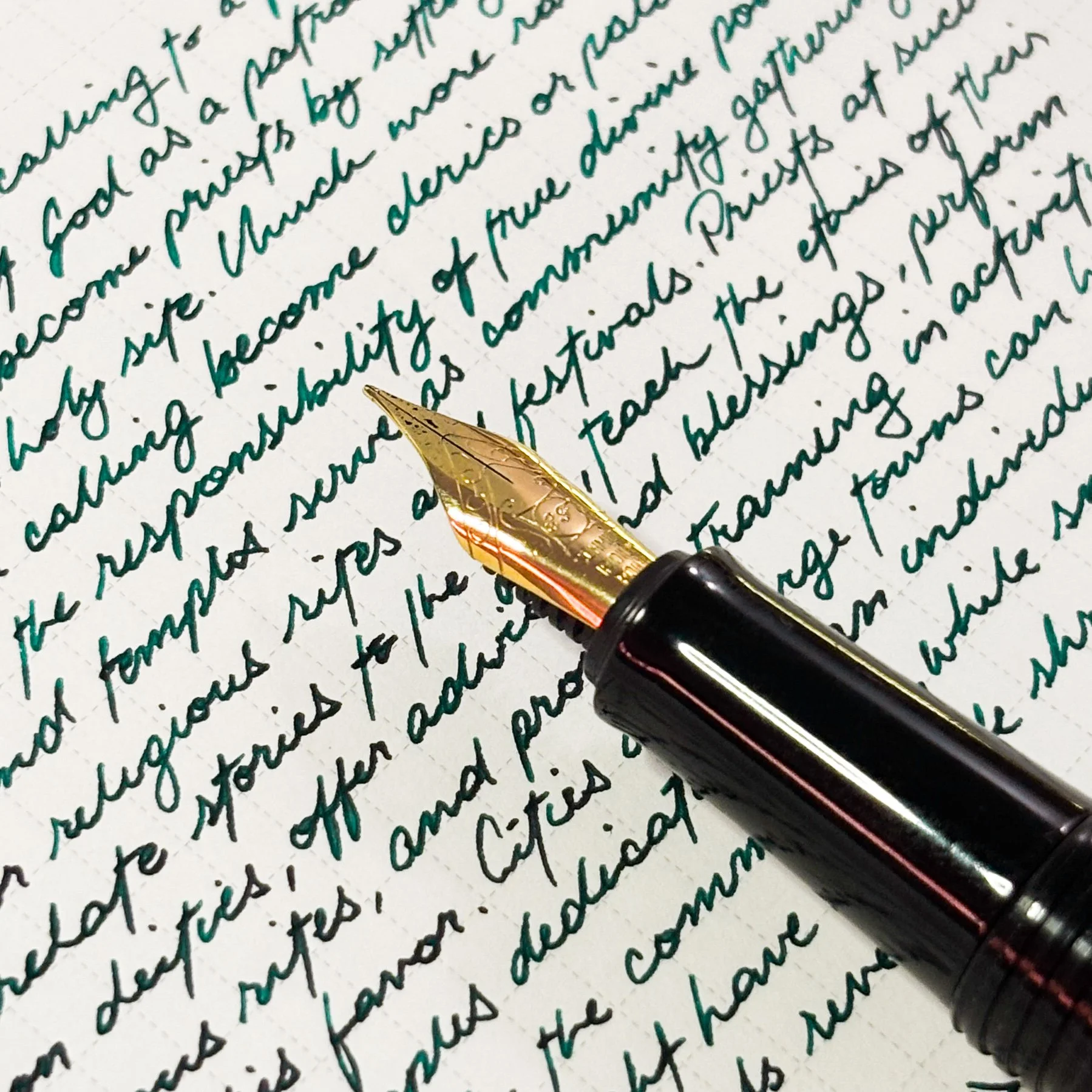 Lady Emerald is quite a fun ink. It’s a deep green colour, featuring some reddish-pink sheen to it. The ink is on the wetter side, which is definitely my experience with sheening inks.