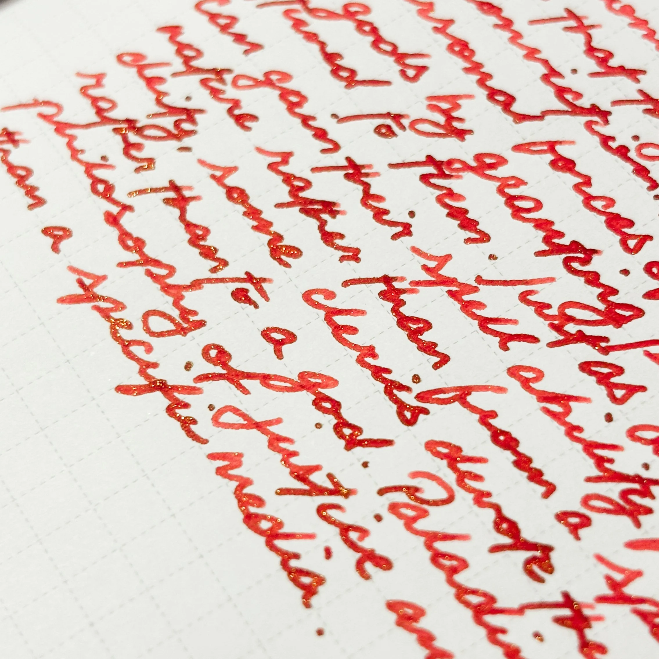 A loud red ink with subtle golden shimmer, and some golden-green sheen.