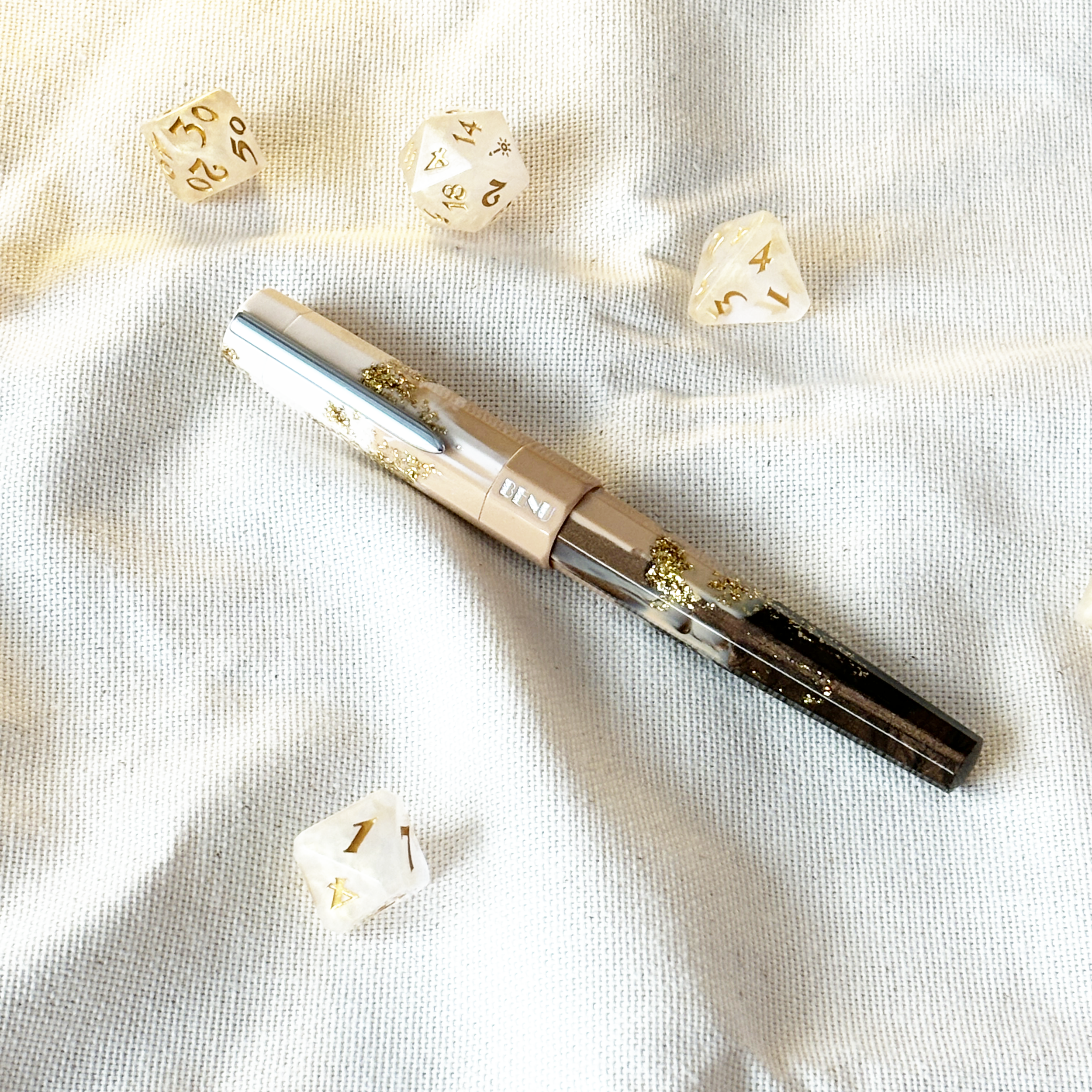 The pen is a gorgeous mixture of a creamy caramel colour, a dark brown with shimmer, and a white resin mixture to cap it off (ayoooo). There’s large speckles of gold foil mixed through as well, for that Benu shimmer many of us have grown to love.
